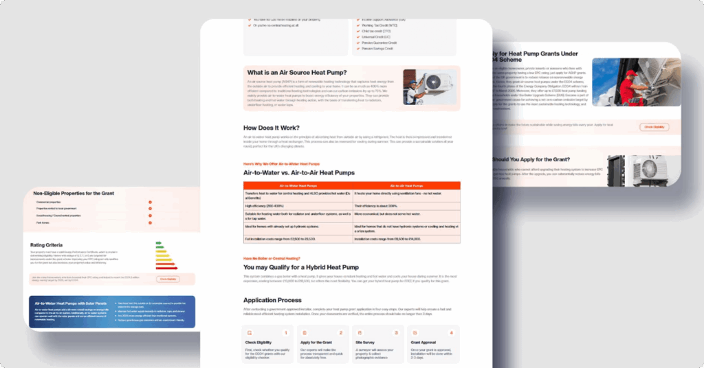 We began with a full discovery phase, diving deep into the boiler grant niche. Our goal was to understand the ECO4 framework, eligibility paths, and regional search intent around terms like “free boiler grant for pensioners” and “ECO4 scheme 2024.”